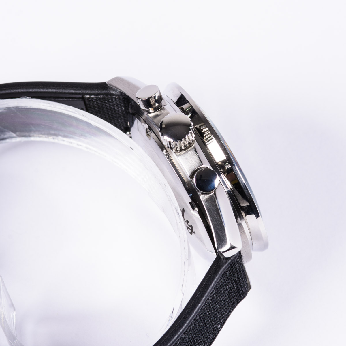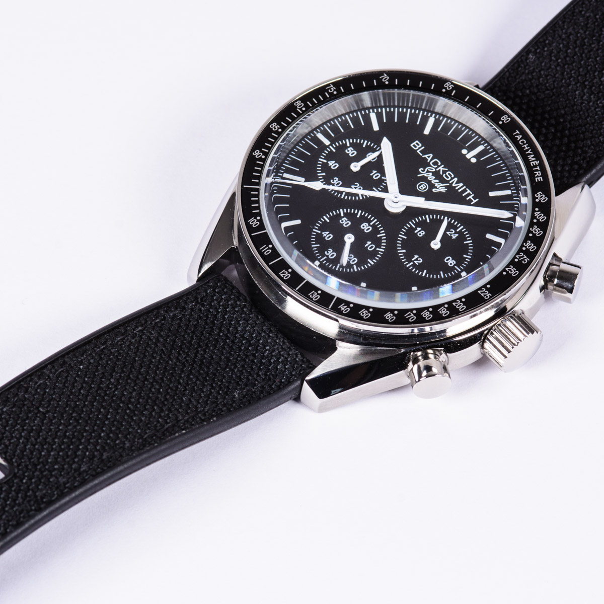- Black FKM rubber/Sailcloth strap and a stainless steel bracelet (Please note, that bracelet clasp style may vary)