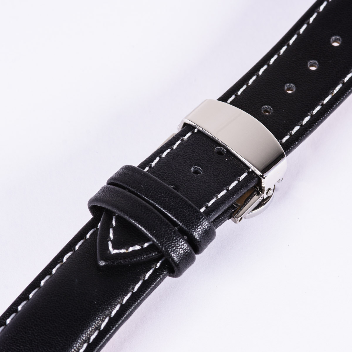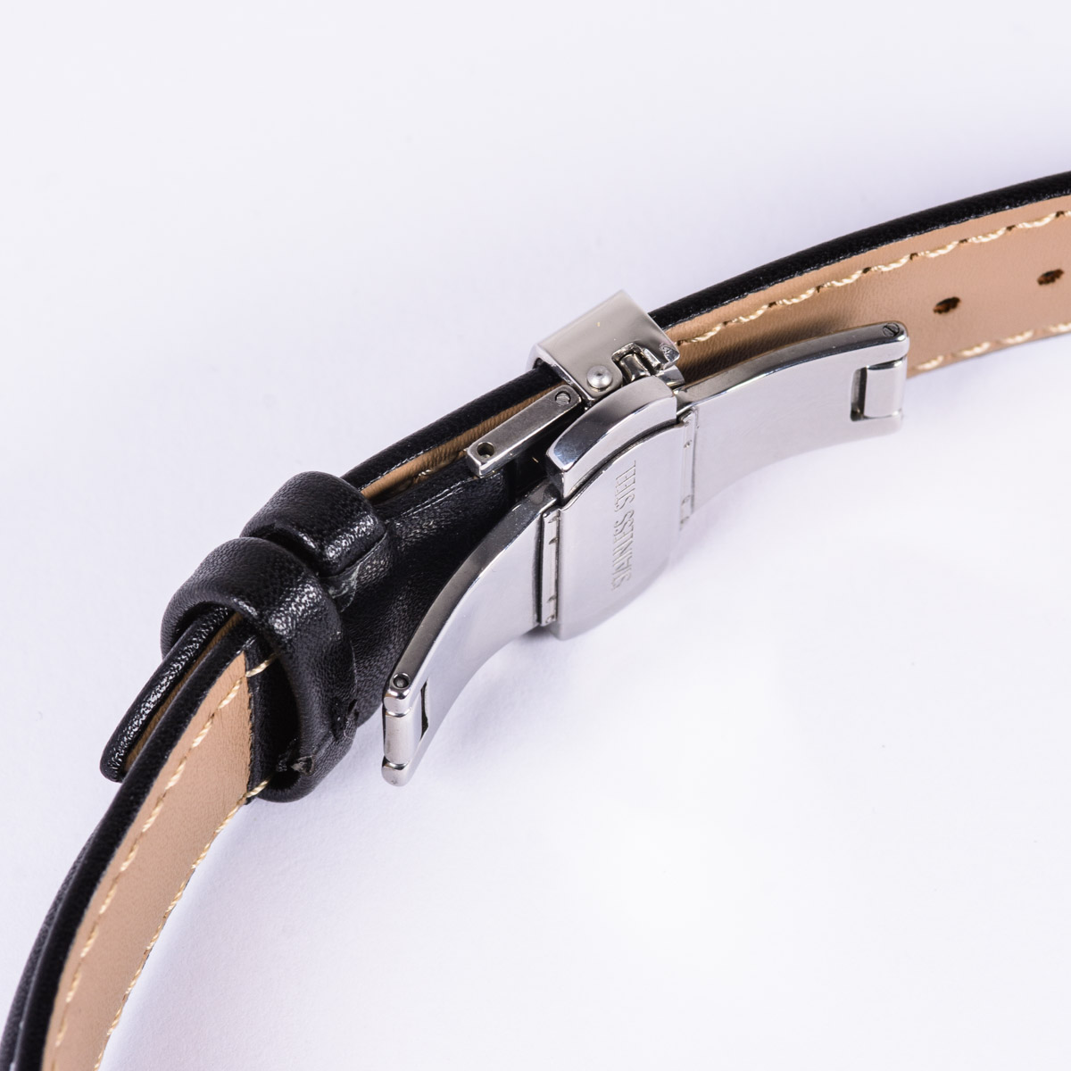 - Steel bracelet with a butterfly clasp and a black leather strap with butterfly clasp